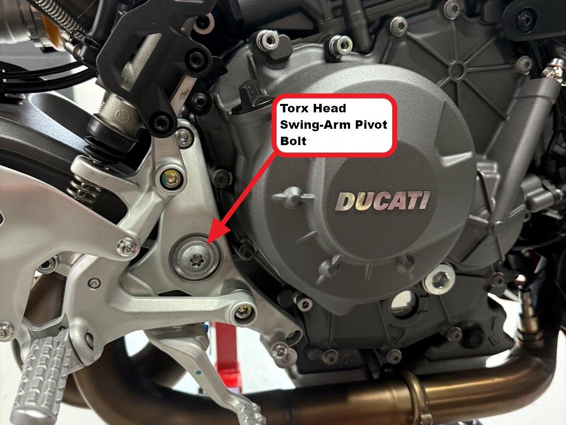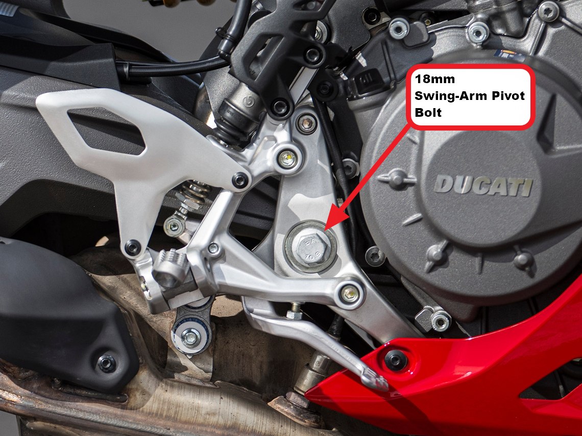 1. The 2025 Panigale, Streetfighter & Multistrada V2 & V2S models should have an 18mm nut fitted to the swing-arm pivot on each side, as per the picture below: